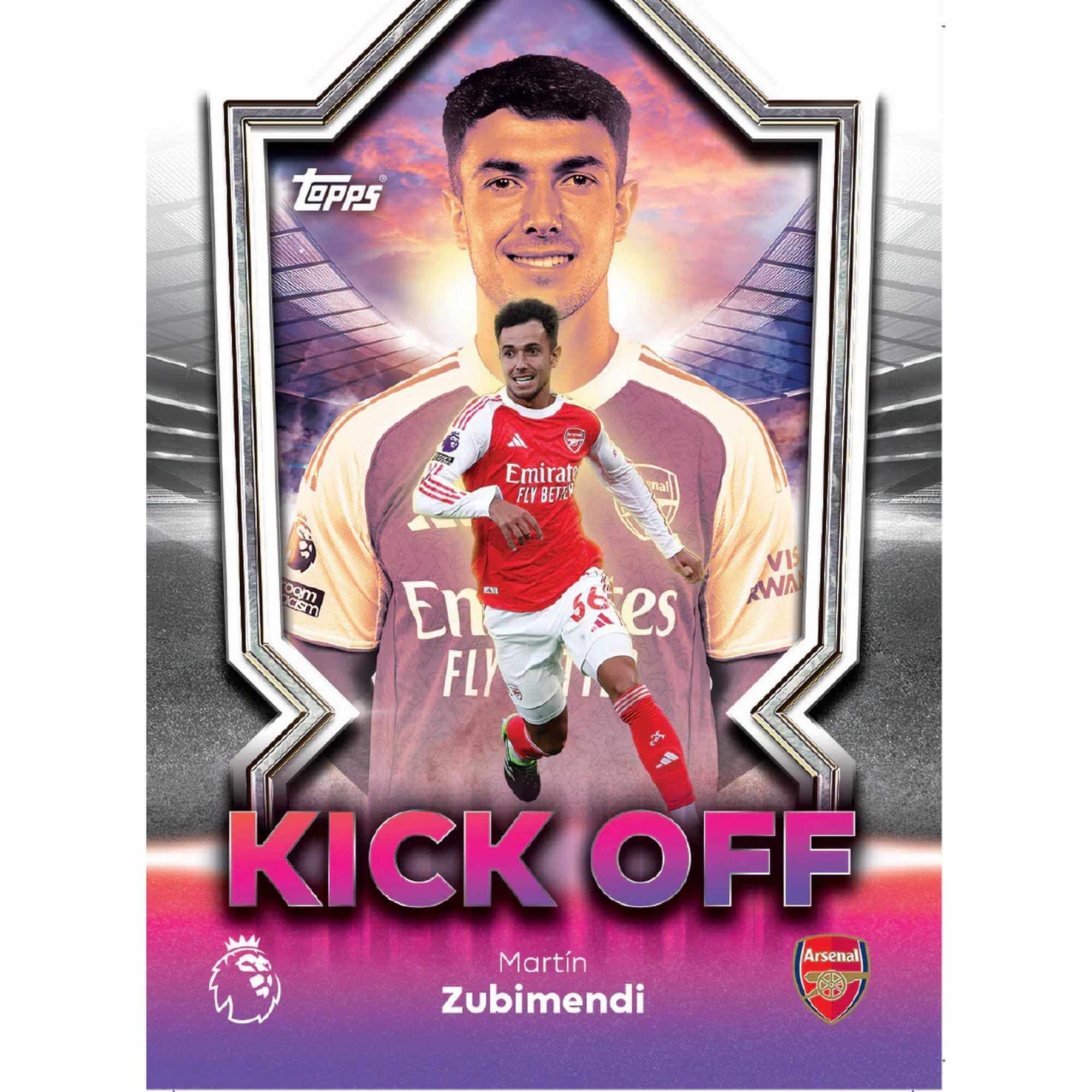 Premier League 2026 Stickers Starter Pack featuring Martín Zubimendi in Arsenal kit.