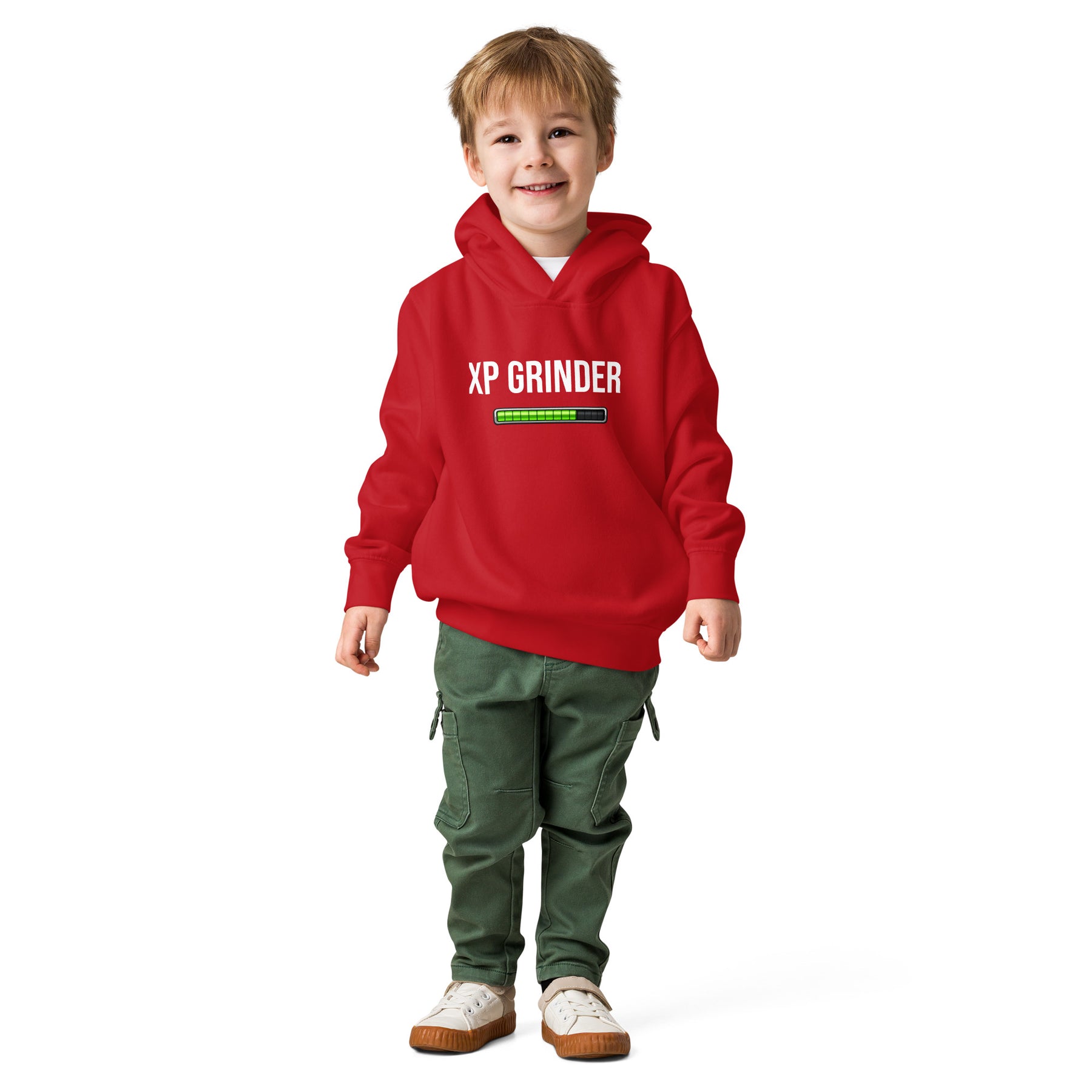 XP Grinder Toddler fleece pullover hoodie on a smiling child in a red hoodie and green pants.