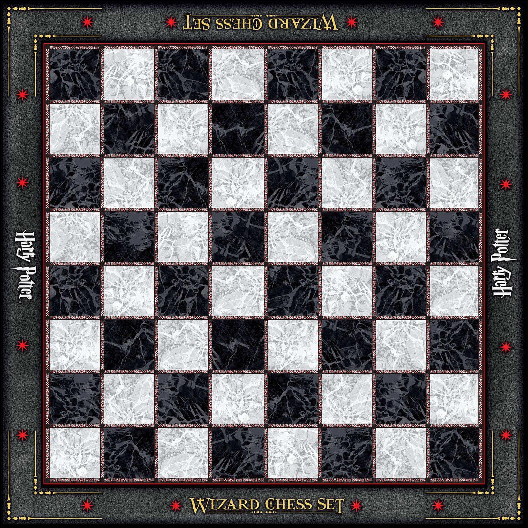 Elegant black and white board of the Harry Potter chess set, featuring a wizard-themed design for exciting gameplay.