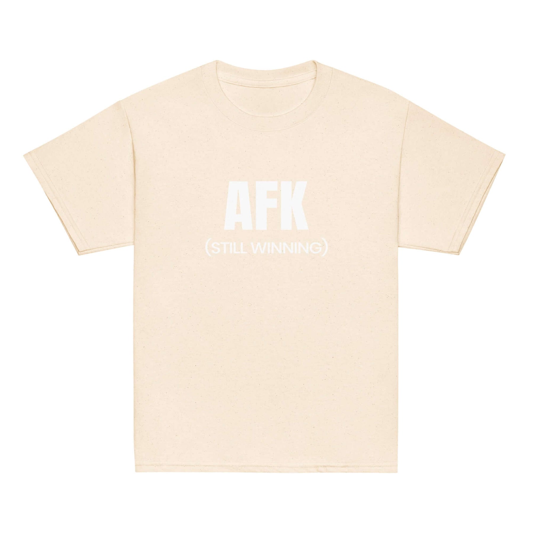 AFK Youth classic tee in beige with text saying 'AFK (STILL WINNING)' on front.