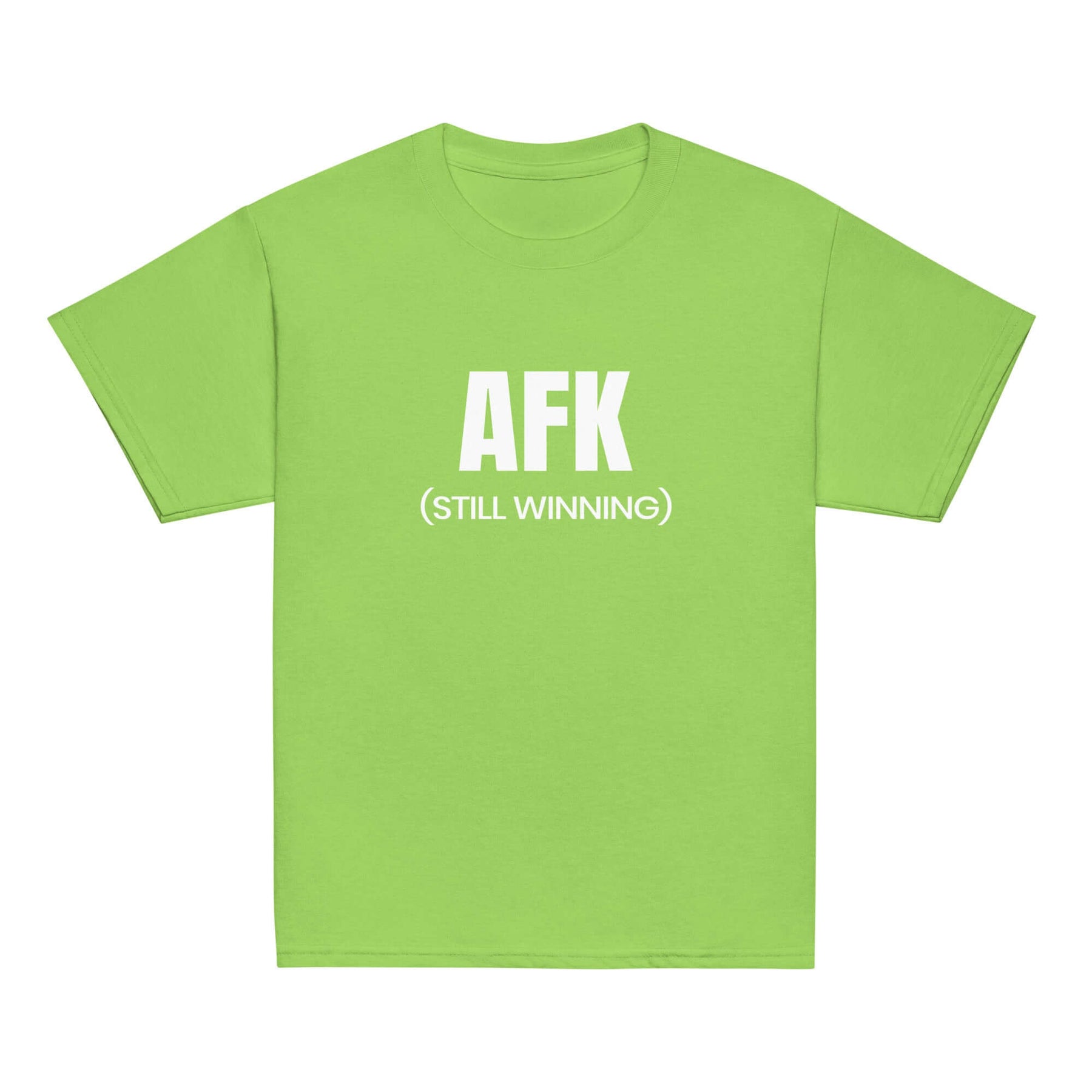 AFK Youth classic tee in bright green with "AFK (STILL WINNING)" printed in white.